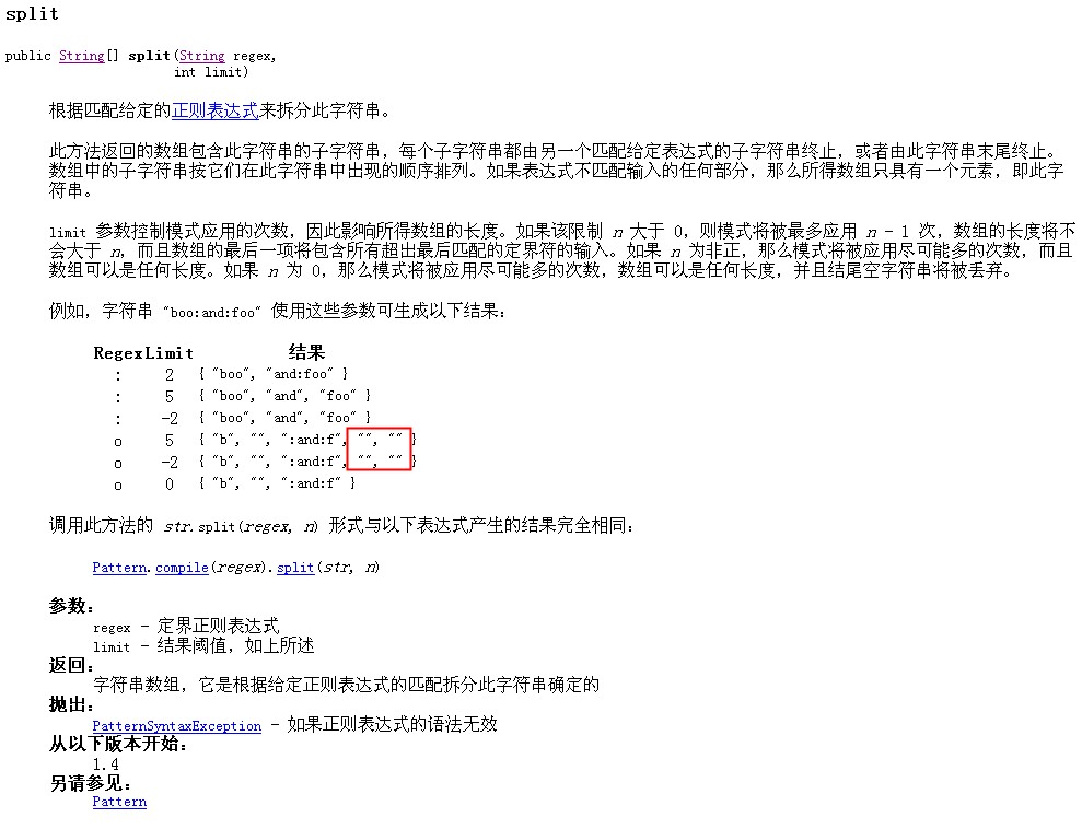 例如”o”split(“o”,5) or “o”split(“o”,-2)时候 结果是”” “” 也就是下图中红框里的内容,所以平时一般都用split(String regex) 方法,其实也就等同于split(String regex,0)方法,把结尾的空字符串丢弃!