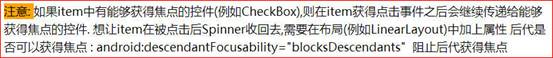 注意: Spinner:如果item中有能够获得焦点的控件(例如CheckBox),则在item获得点击事件之后会继续传递给能够获得焦点的控件.